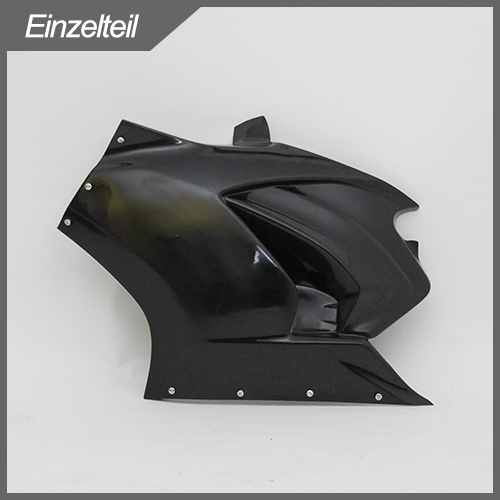 Leichtes Verkleidungsteil aus gewebter GFK-Matte mit schwarzem Deckschichtharz (Gelcoat), inkl. vormontierten Dzus-Panex Schnellverschlüssen. Die Befestigungspunkte sind zusätzlich mit Kohle-Kevlar-Gewebe verstärkt, jedoch nicht vorgebohrt. Das Gewicht ist mit Carbon vergleichbar. Die Teile sind nicht grundiert oder lackiert.